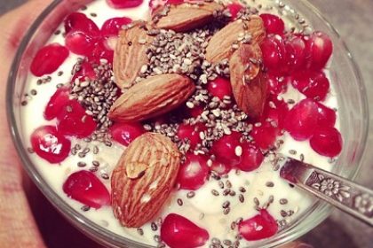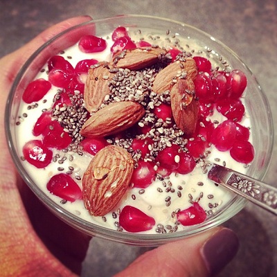 1. Place the Greek yogurt in a bowl, followed by the pomegranate seeds, raw almonds, chia seeds and drizzle some honey on top for sweetness).